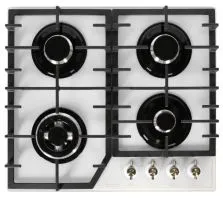 Тип подключения: Газовый; Количество зон приготовления: 4; Цвет модели: Белый; Материал варочной поверхности: Стекло; Материал решеток варочной поверхности: Чугун
