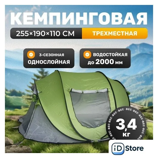 кемпинговая, весна/лето/осень, 3-местная, 2 входа, 1 комната, противомоскитная сетка, штормовые оттяжки, ДхШхВ: 255x190x110 см. Доставим по Минску в день заказа, при оформлении заявки до 14.00. Официальная гарантия.