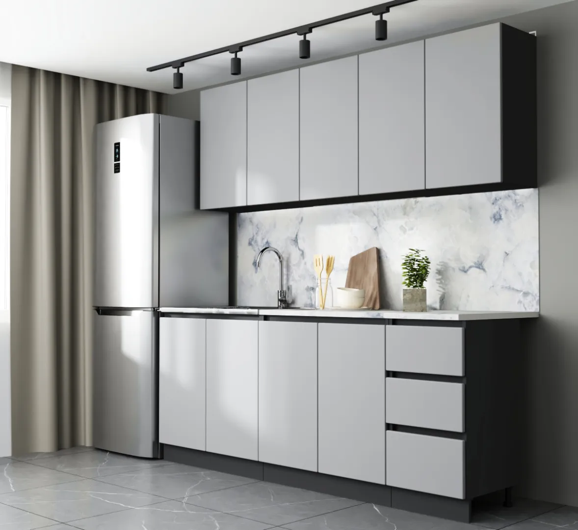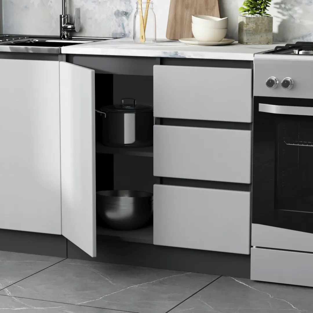 Кухня "Мэри" — это гармония стиля и функциональности, созданная с использованием ЛДСП, что делает её современным и бюджетным вариантом для любого интерьера. Эстетика данного изделия подчеркивается интегрированными ручками, которые обеспечивают удобство в использовании. Роликовые направляющие делают процесс открывания и закрывания шкафчиков легким и бесшумным, что особенно важно в динамичном ритме повседневной жизни.