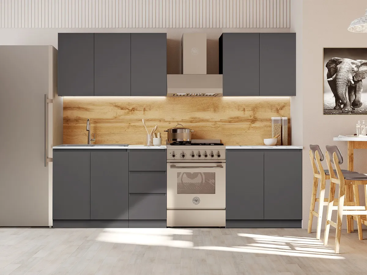 Кухня "Мэри" — это гармония стиля и функциональности, что делает её современным и бюджетным вариантом для любого интерьера. Эстетика данного изделия подчеркивается интегрированными ручками, которые обеспечивают удобство в использовании. Роликовые направляющие делают процесс открывания и закрывания шкафчиков легким и бесшумным, что особенно важно в динамичном ритме повседневной жизни.