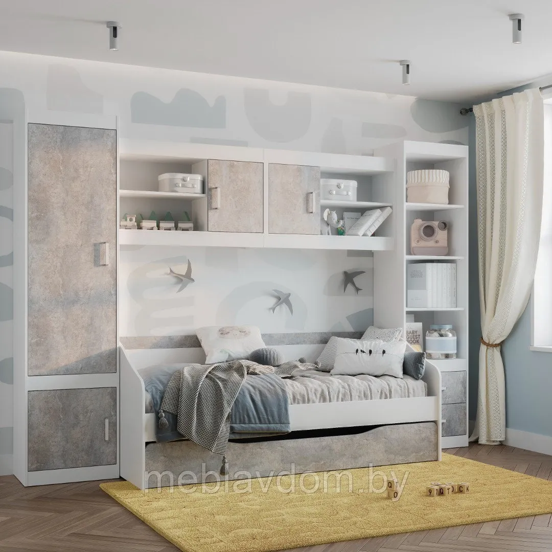 Кровать уже оснащена настилом для матраса, что обеспечивает высокий уровень комфорта. Модульная конструкция серии позволяет выбрать только необходимые элементы мебели, такие как кровать, шкаф, пенал, письменный стол и навесные полки. Это поможет создать стильную, удобную и экономичную обстановку в детской комнате.