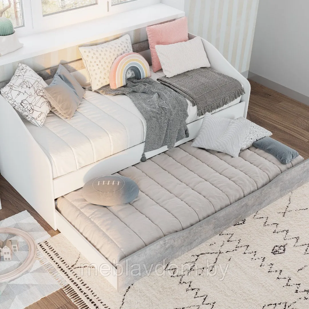 Односпальная кровать Caydence с двумя выдвижными ящиками внизу, реечным основанием и мягкой светлой обивкой. Уютная и мягкая кровать, обтянутая красивой тканью, станет настоящим украшением любого интерьера.Односпальная кровать Caydence — это практичный и эстетичный предмет мебели, который идеально дополнит пространство детской или подростковой комнаты. Высокие бортики и два вместительных ящика обеспечивают комфорт и практичность, а современный дизайн впишется в самые разные интерьеры. Нежный кремовый оттенок и пушистая, мягкая ткань создают теплую и уютную атмосферу, идеально подходящую для хорошего ночного сна.