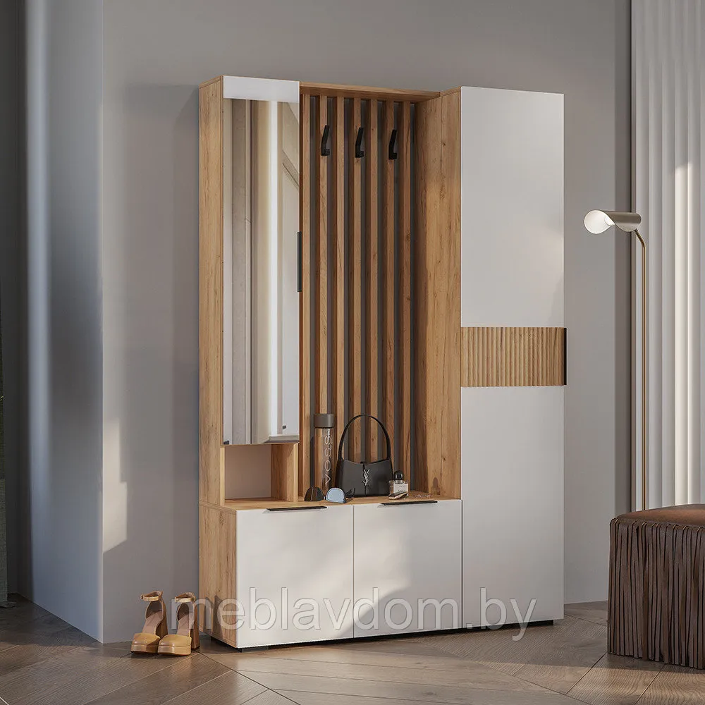 Модульная прихожая Санса — это стильный и функциональный комплект для прихожей, который идеально впишется в любой интерьер благодаря своему уникальному дизайну. В комплект входят отдельный модуль прихожей и двустворчатый шкаф с вместительным отделением для обуви, выдвижным ящиком для мелких предметов, открытыми полками, зеркалом, за которым скрыто дополнительное пространство для хранения, а также открытой секцией с крючками и штангой для одежды. Ящики открываются легким нажатием на фасад. Внутреннее пространство шкафа включает штангу для одежды на вешалках и множество полок для сезонной одежды, белья, обуви, головных уборов и аксессуаров. Нейтральные и спокойные тона создают атмосферу уюта и гармонии в вашем доме.Универсальная сборка.