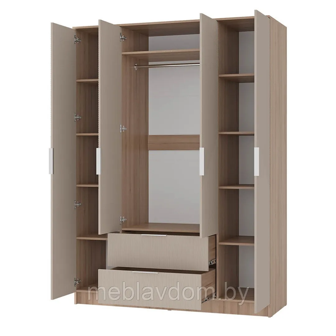Шкаф 4-дверный Эмилия – идеальное решение для тех, кто предпочитает элегантные, минималистичные, но в то же время оригинальные и выразительные предметы мебели для своего дома. Нейтральная цветовая гамма, простая конструкция и ненавязчивая геометрическая фрезеровка фасадов позволяют легко и гармонично интегрировать этот шкаф в любой интерьер.