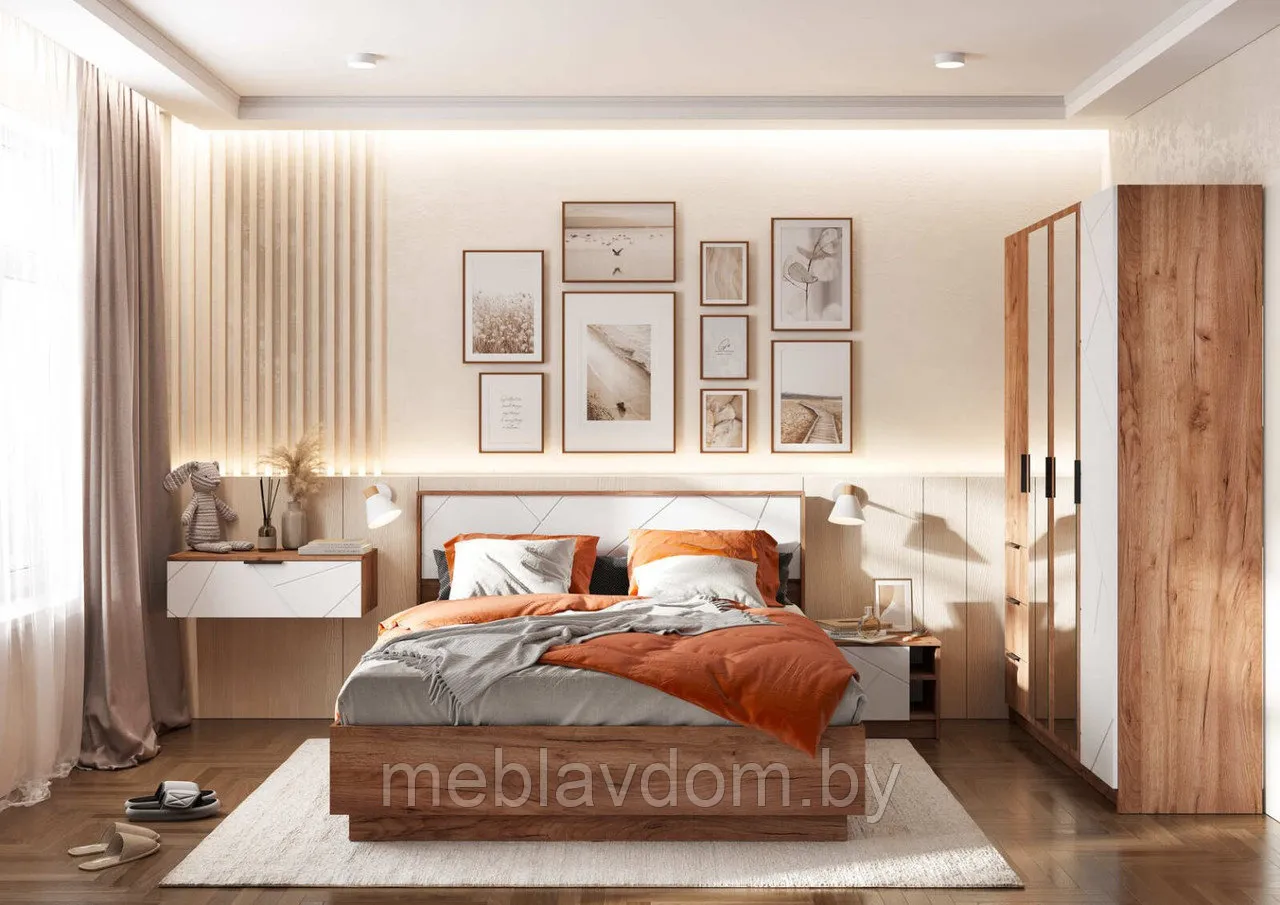 Детская «Орегон» — стильное и практичное решение для спальни. Комплект состоит из двуспальной кровати с высоким изголовьем и ортопедической основой из дерева, прикроватной тумбочки, навесного комода с выдвижным ящиком и четырехдверного шкафа с полками, штангой и зеркальными дверцами. МДФ-фасады с геометрической фрезеровкой в белом цвете и корпус оттенка "Дуб Крафт табачный" придадут комнате уют и тепло, а белый цвет добавит лёгкости и визуально расширит пространство.Коллекция мебели «Орегон» представляет собой современное воплощение гармонии и величия геометрических форм, вдохновлённых величественными египетскими пирамидами. Лаконичные линии и идеальные грани фрезерованных фасадов напоминают силуэты древних сооружений, способных выдержать испытание временем. Фрезеровка фасадов коллекции «Орегон» выполнена в современном стиле с геометрическими линиями, пересекающимися под разными углами, что создаёт динамичный асимметричный рисунок и подчёркивает уникальный стиль мебели. Сочетание древесной текстуры с контрастными фасадами "Белый" и "Асфальт супермат" добавит вашему пространству атмосферу загадочности и величия.