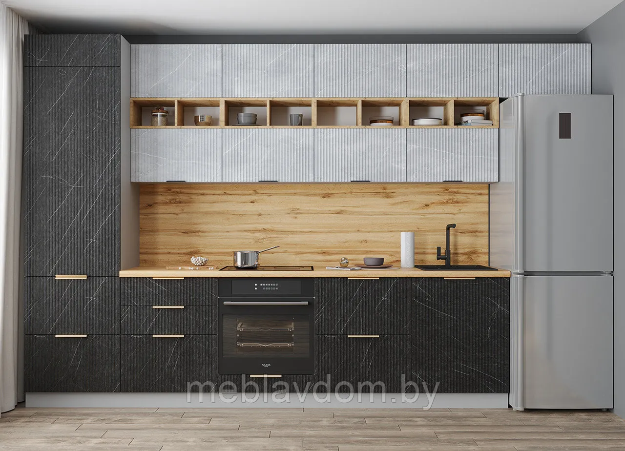 Кухня Мила лайт - это типичная кухня современного города: прагматичная, аккуратная и нескучная. B таком интерьере есть легкость и нет ничего лишнего. Благодаря лояльному дизайну, КУХНЯ ЛАЙТ представляет часть любого интерьера, лишь дополняя его и подчеркивая. Поэтому ее можно реализовать как в компактной, так и в просторной кухне, совмещать с гостиной, используя универсальные черты размеры готового кухонного гарнитура. Преобладание эко-текстур в расцветке ЛАЙТ так же внесет вклад в комфортную атмосферу вашего дома. Городской облик кухни ЛАЙТ, как и пейзаж мегаполиса, вероятно украсят живые растения в стилизованных горшках и вазах или наполненная фруктами. Важным отличием ЛАЙТ является ее универсальные размеры без декомпозиции на модули, что дает вам преимущество во времени ожидания готовой кухни.В данной кухне имеется фасад под посудомоечную машину и пенал под духовку и микроволновку.