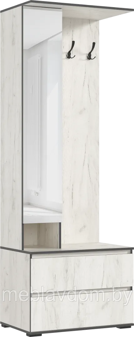 Эта компактная и функциональная прихожая идеально подойдет для гостиной. В комплект входят двустворчатый шкаф с штангой, антресольной полкой и полкой для обуви, а также открытый пенал с множеством полок и прихожая с зеркалом на фасаде и выдвижными ящиками. Все дверцы открываются легким нажатием на фасад, без ручек.Модульная прихожая «Норд» доступна в различных цветовых решениях.