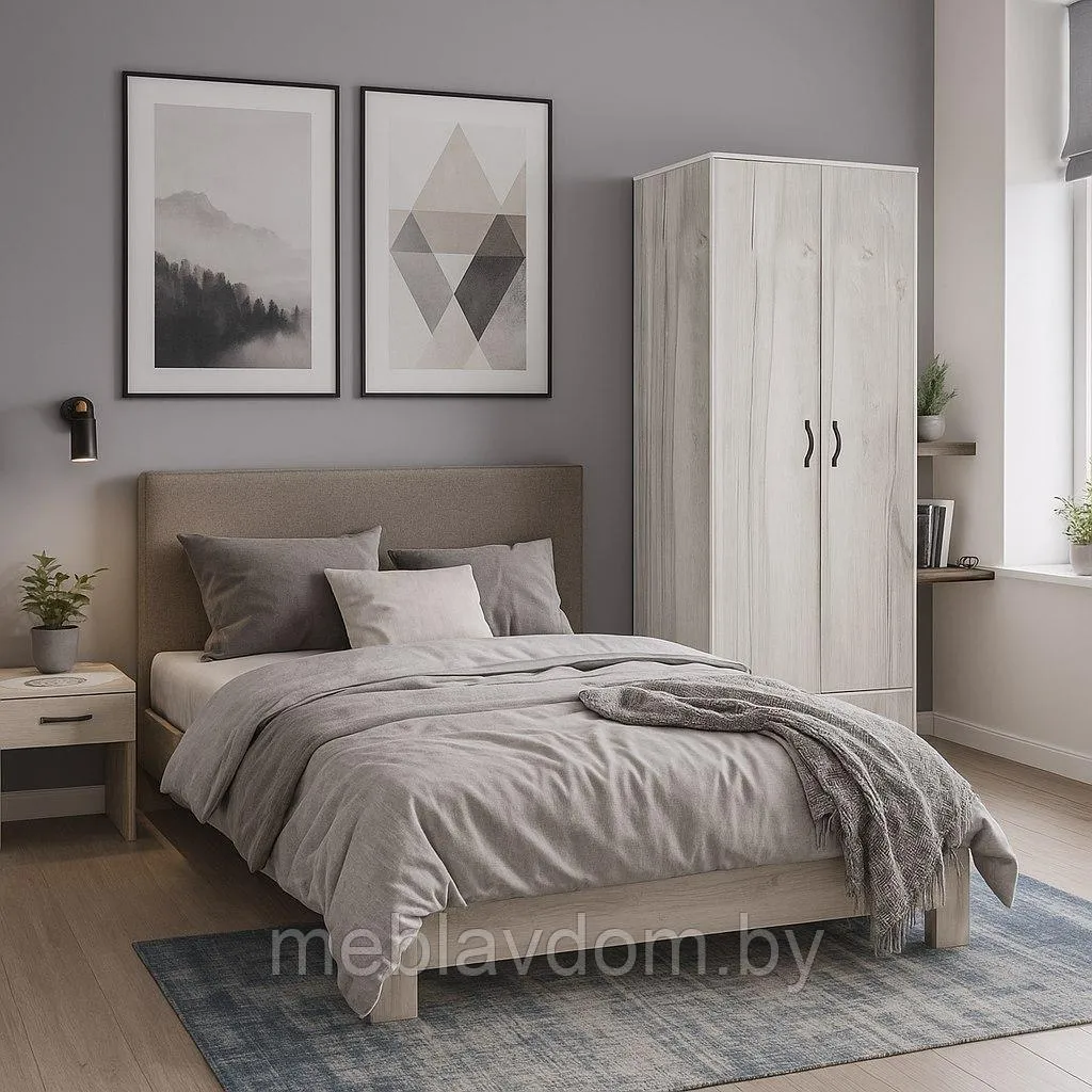 Комфортная и стильная спальня Функциональная спальня в стиле неоклассики отвечает последним трендам дизайна мебели и актуальна во все времена. Фрезерованные фасады из МДФ с текстурой дерева, фигурный карниз и стильные металлические ручки цвета бронзы придают изысканность спальне, а белоснежный цвет декора расширяет пространство, добавляет воздушности и свежести. Система Лацио состоит из множества отдельных модулей, благодаря чему можно легко подобрать мебель для комнаты любого размера и нужного вам функционала. Антресоли для шкафов позволяют рационально использовать пространство, максимально увеличивают высоту и вместимость модуля. Характеристики Размеры: Ширина: 145.5 см Глубина: 204 см Высота: 91 см Размеры спального места: Ширина: 140х200 см Основные материалы: Корпус ЛДСП (Kronospan Австрия) Фасады МДФ Задние стенки и донья ящиков ЛХДФ (Kronospan Австрия) Цвет корпуса: Белое дерево Цвет фасадов:  Белое дерево Основание кровати: ЛДСП
