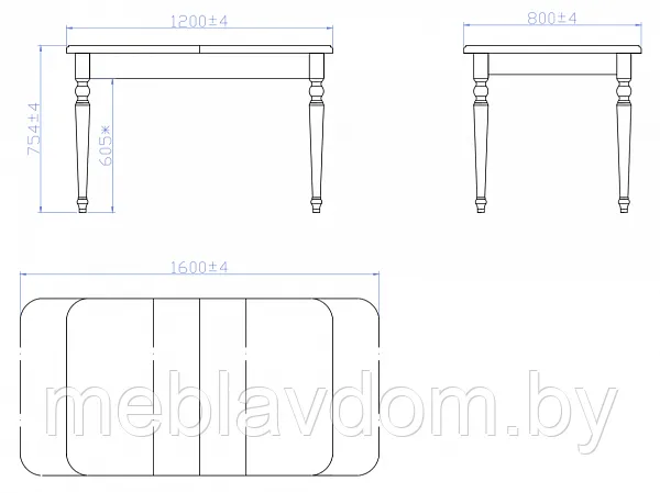 Габаритные размеры стола: 1200(1600)х800х755 мм. Стильный и удобный прямоугольный обеденный стол на четырех элегантных ножках. Выполнен в классическом стиле. Стильный и красивый стол будет замечательным дополнением к интерьеру Вашего дома.