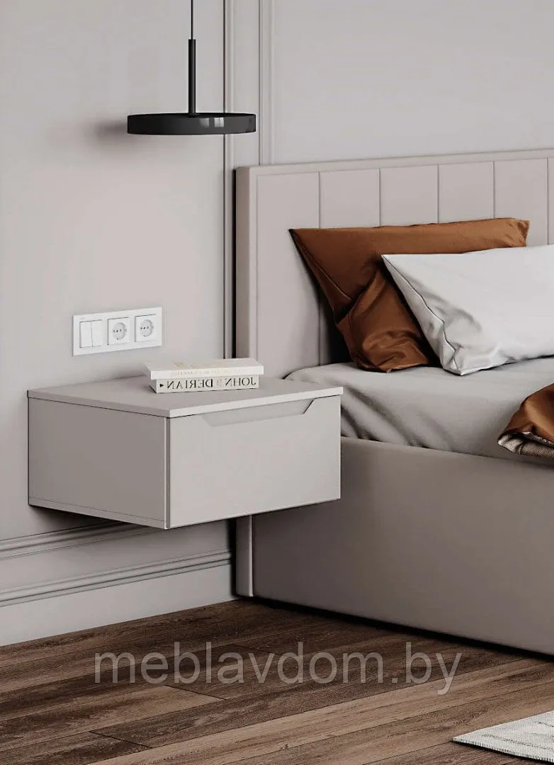 Прикроватные тумбы имеют отделения для хранения вещей, закрывающиеся створками, и открытые полки сверху для настольной лампы или телефона.