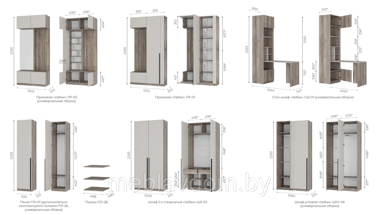 вместительные 1дверный и 2дверный шкафы с зеркалами и с глухими фасадами; 2-дверный шкаф можно дополнительно укомплектовать полками (доп. опция, приобретаются отдельно);