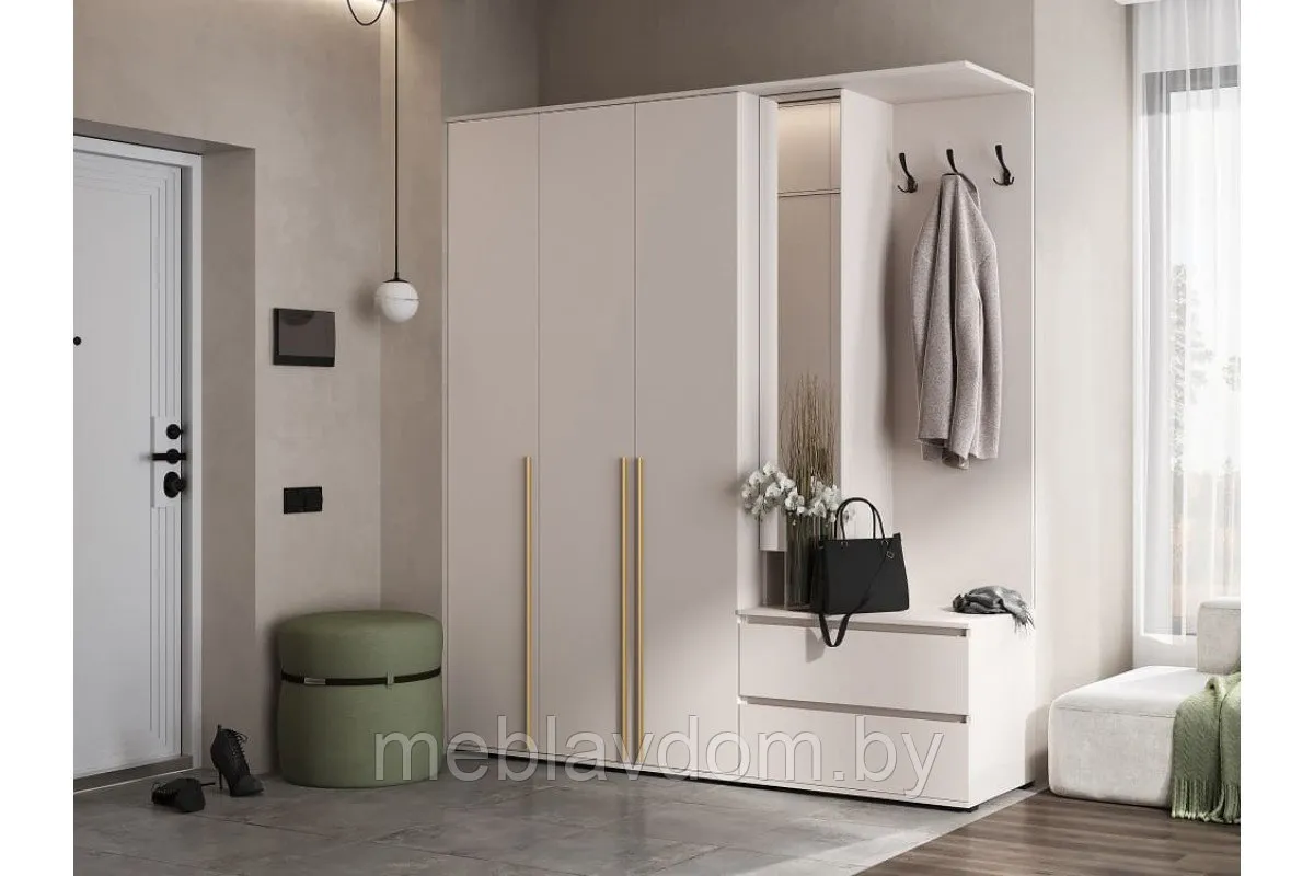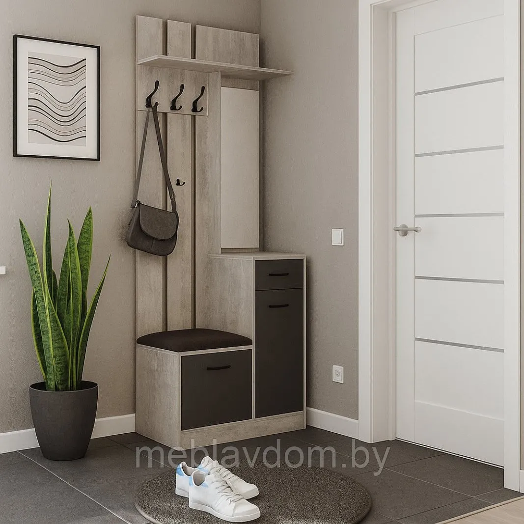 Комплект мебели для прихожей, размещаемый сразу за входной дверью, предназначен для хранения верхней одежды и обуви. В его состав входят вешалка с тумбой и трёхстворчатый шкаф.Шкаф оснащён шариковыми направляющими, обеспечивающими плавное и бесшумное открывание дверей, накладными петлями и угловыми навесами с заглушками. Трёхрожковый крючок и прочные опоры гарантируют удобство использования и устойчивость конструкции.
