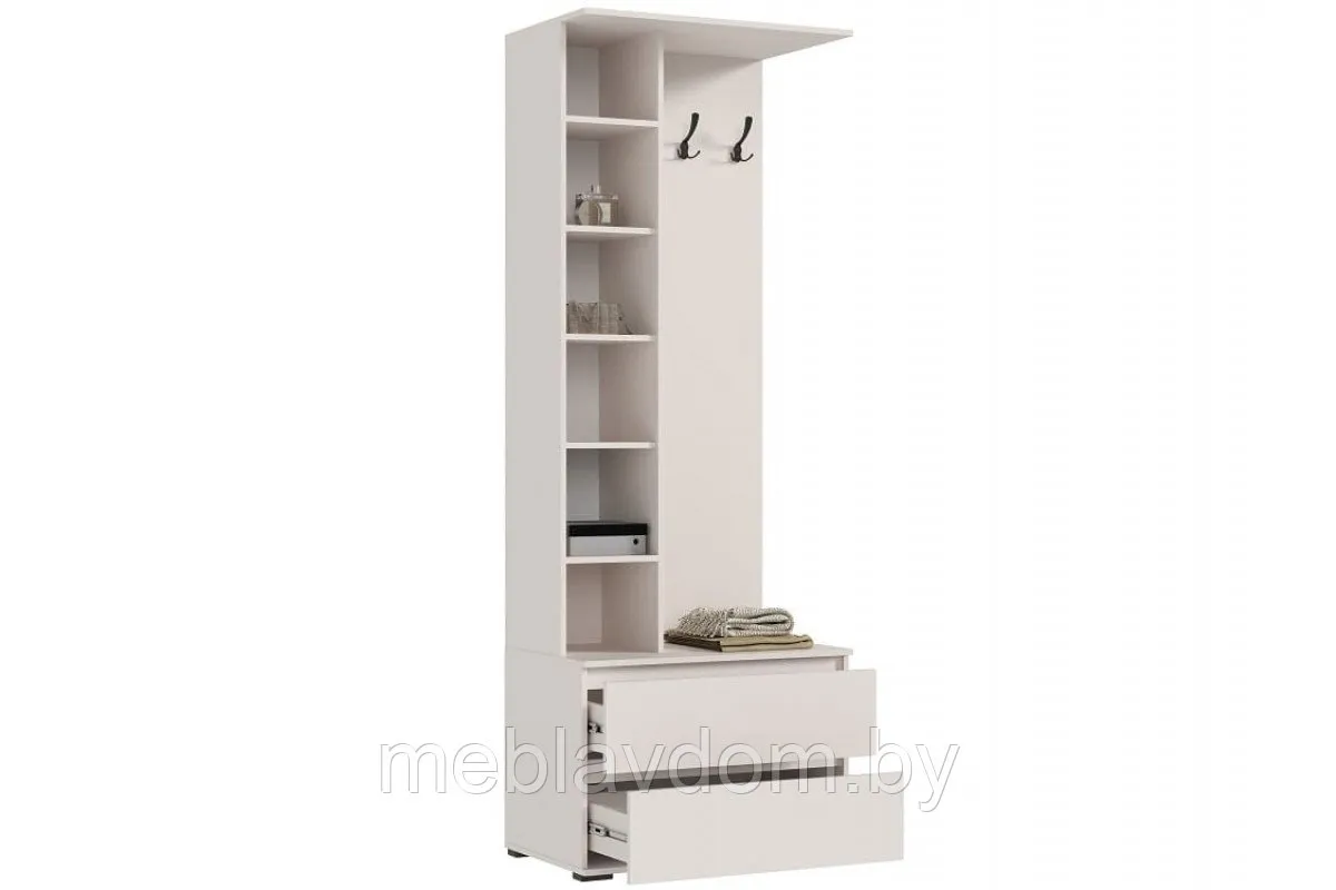 Прихожая «Норд» — это модульный элемент из одноименной серии мебели. Компактная и функциональная, она может служить полноценной прихожей даже в небольших помещениях. Модуль включает пенал с полками и зеркалом, выдвижные ящики на шариковых направляющих и заднюю стенку из ЛДСП, к которой крепятся три черных крюка для одежды. Все дверцы открываются легким нажатием, без ручек.