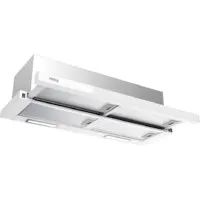 конструкция телескопическая, монтаж для встраивания, ширина 89.8 см, управление механическое/кнопочное, производительность мотора 800 м³/ч, цвет белый/нержавеющая сталь. Имеются в продаже оригинальные угольные фильтры для данной модели.