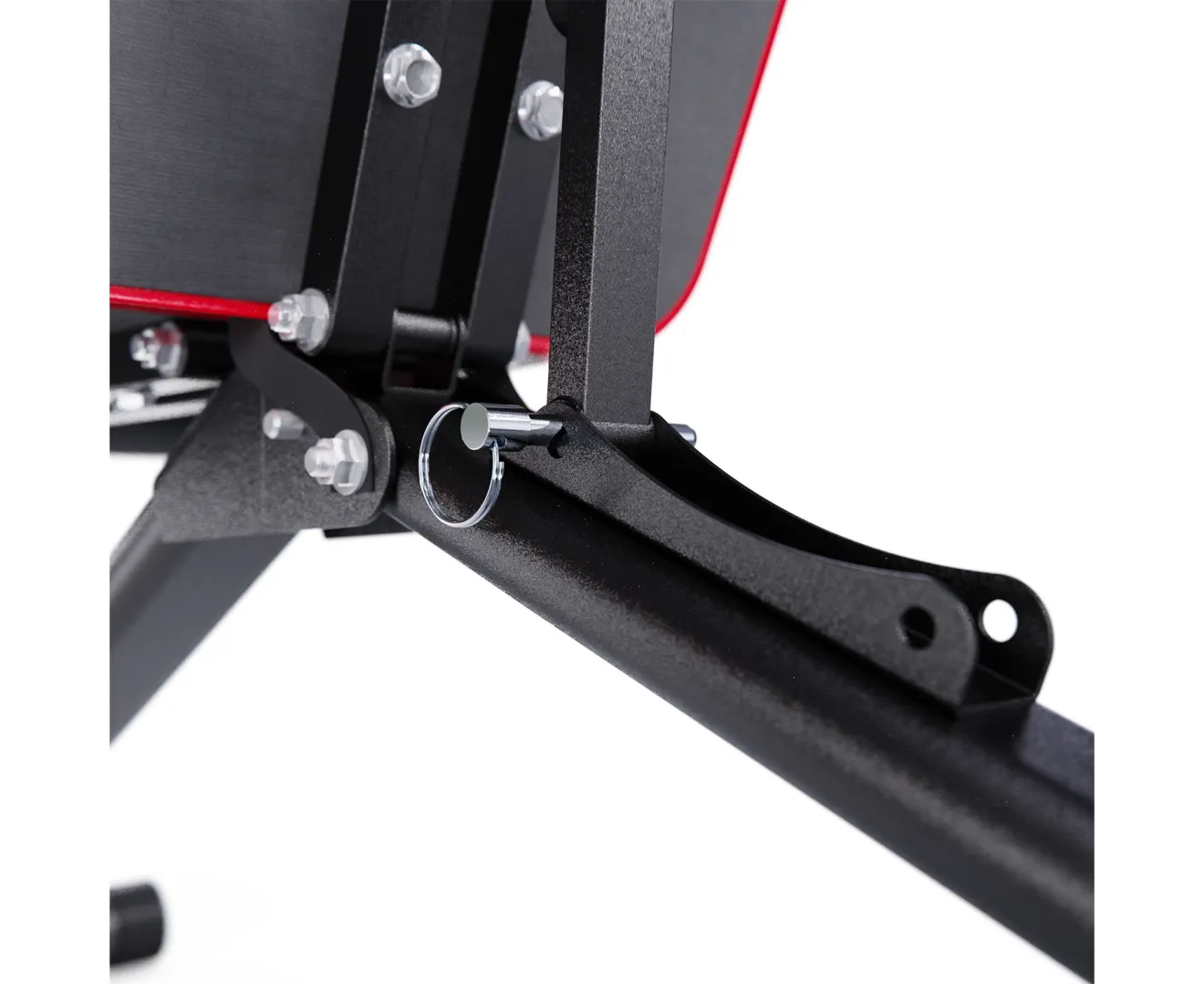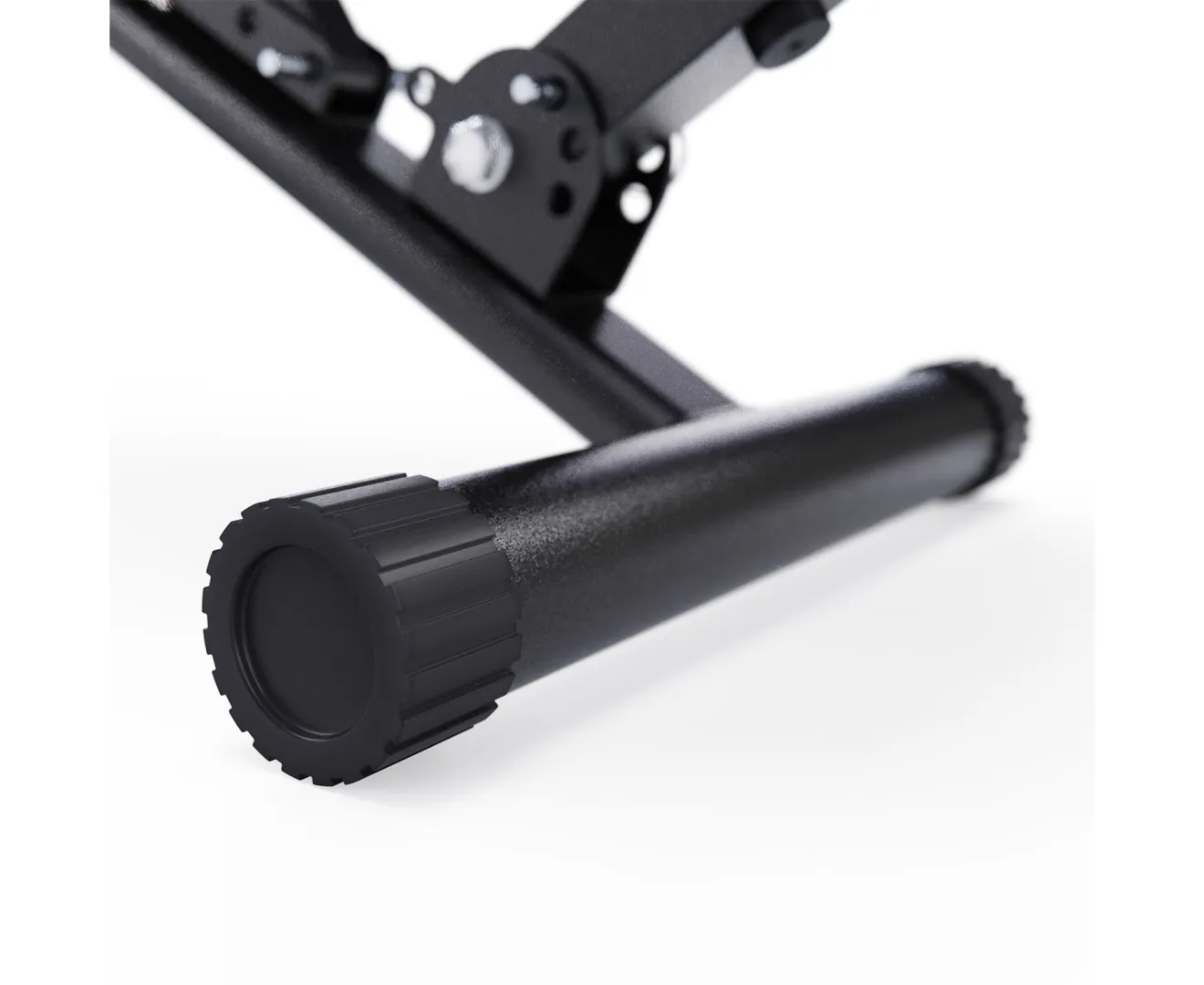 Конструкция обеспечивает стабильность благодаря профилю рамы 30×70×1,5 мм и компенсаторам неровности пола. Скамья оснащена регулируемой спинкой с фиксацией в 6 положениях, что позволяет выполнять жимы под разными углами. Сиденье регулируется на 3 уровня, высота от сиденья до пола составляет 41 см. Валики для ног из вспененного материала также имеют 3 уровня регулировки для надёжной фиксации.