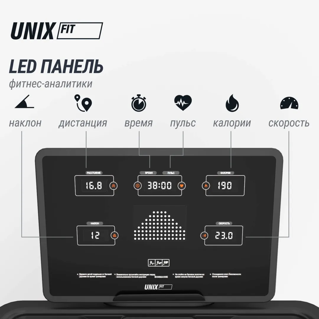 Показатели компьютера: время, скорость, дистанция, калории, пульс, наклон бегового полотна, быстрое переключение скорости с шагом 2,4,6,8,10,12,14,16 км/ч и переключение угла наклона бегового полотна с шагом 0,3,6,9,12,15,18,20%
