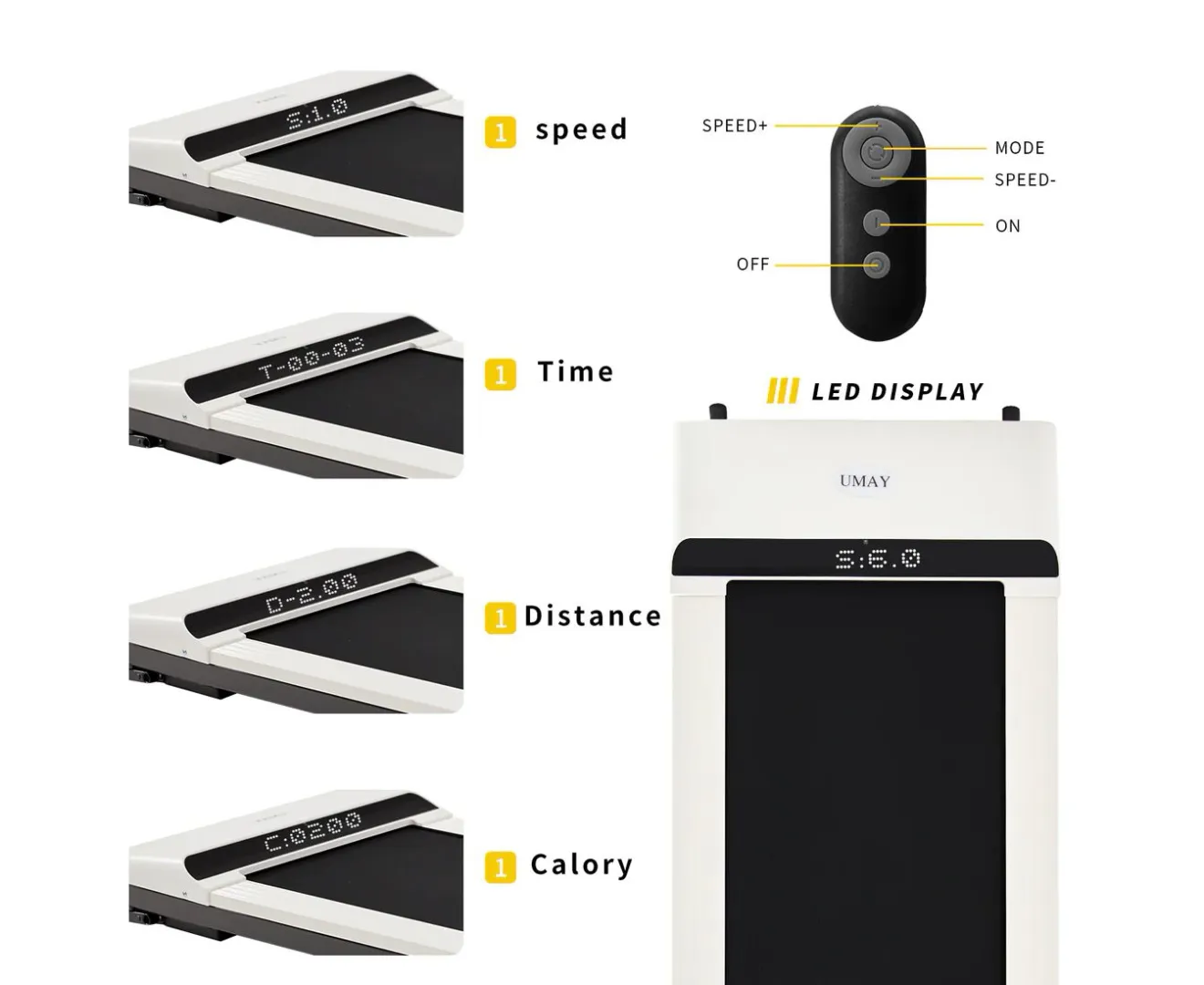 На LED-дисплее отображаются время, скорость, дистанция и количество сожженных калорий. Управление осуществляется с помощью пульта дистанционного управления. Для удобства перемещения предусмотрены транспортировочные ролики.
