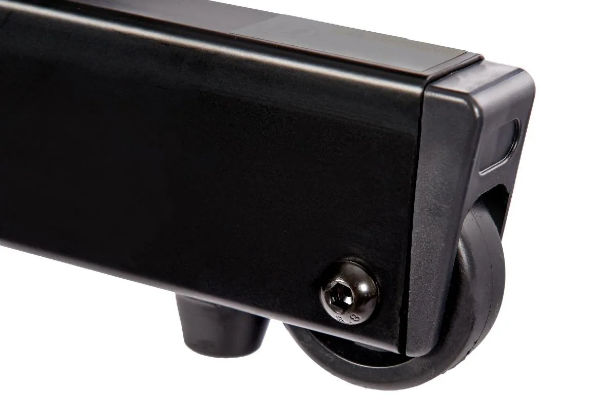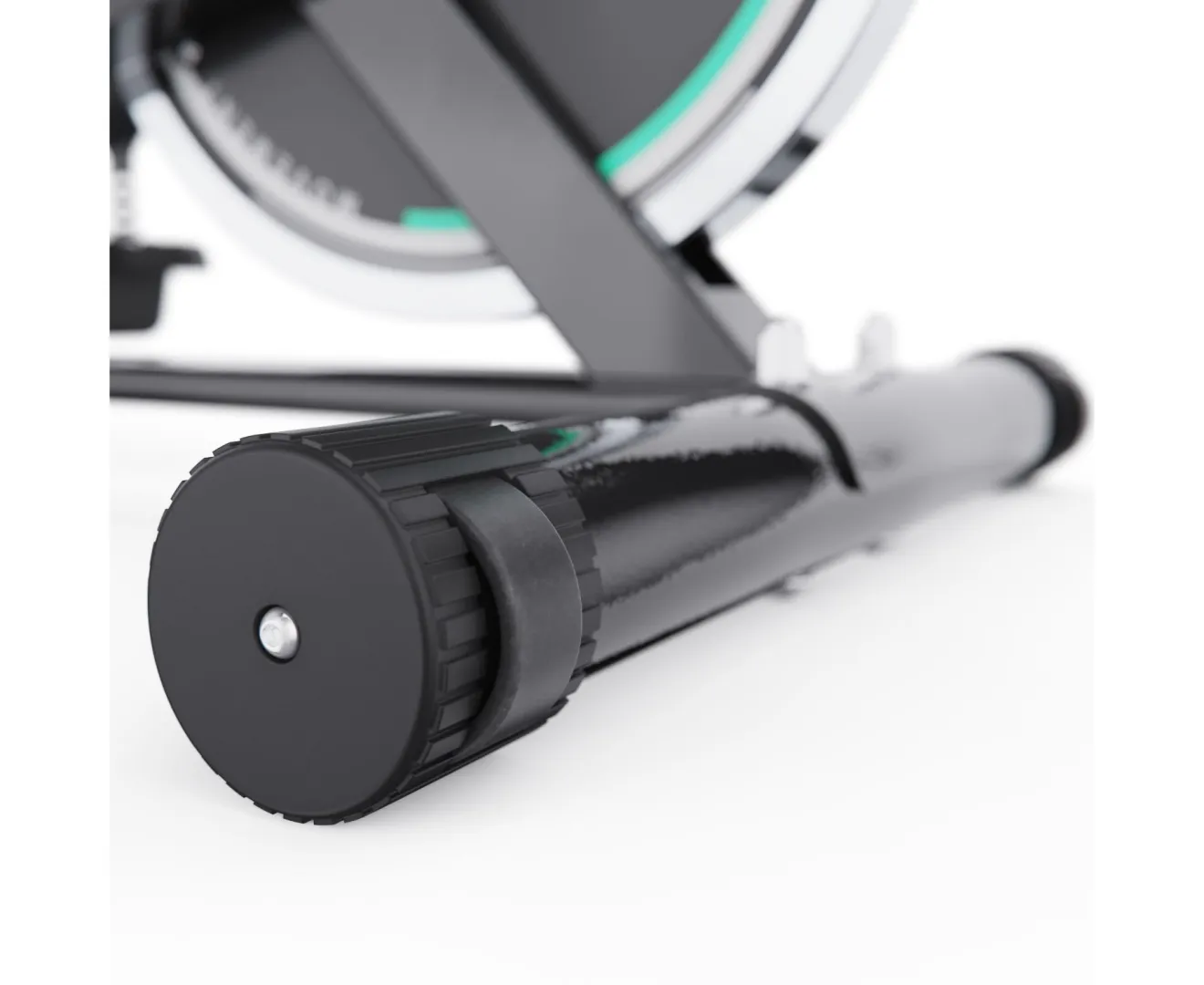 Конструкция включает прочную стальную раму, антискользящие ножки с компенсаторами неровности пола для устойчивости, транспортировочные ролики для удобного перемещения, а также держатель для бутылки и подставку под планшет. Компактные габариты (103×46×103–113,5 см) и лаконичный чёрный цвет позволяют тренажеру органично вписаться в интерьер даже небольшого помещения.