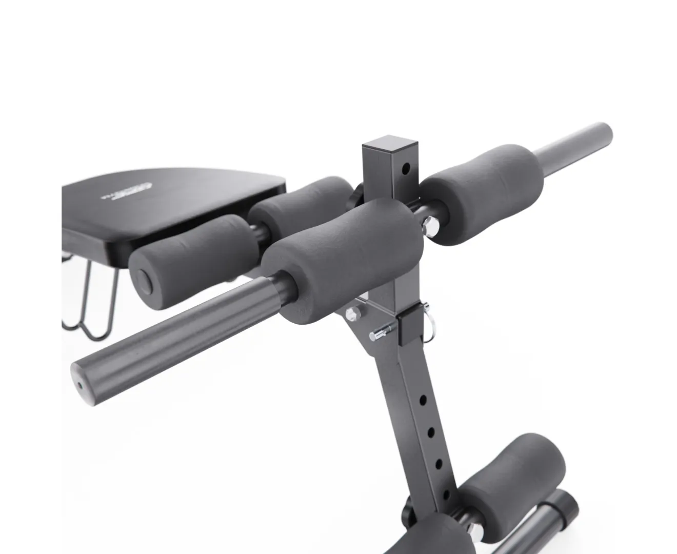Ключевой особенностью является 5 уровней регулировки угла наклона, что позволяет эффективно прорабатывать разные группы мышц. На скамье можно выполнять подъёмы корпуса и ног для пресса, а также упражнения с гантелями. Нижние валики регулируются на 4 уровня для надёжной фиксации стоп, а эргономичные валики из вспененного материала обеспечивают комфорт. В комплект входят стойка для отжиманий и упоры, расширяющие спектр упражнений.