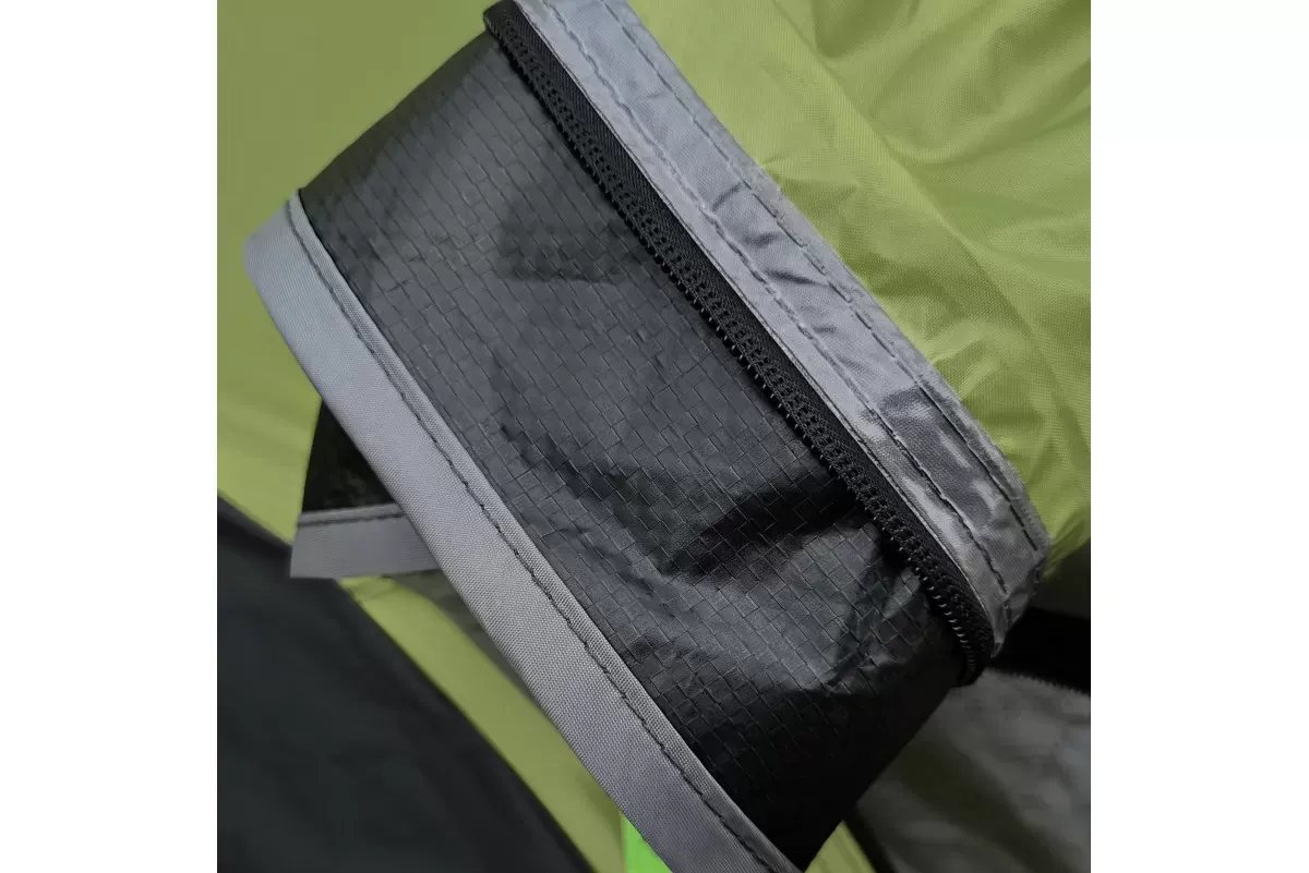 В комплект входят 4 штормовые оттяжки со светоотражающей нитью и колышки для крепления при ветре. Молнии оснащены тканевыми пуллерами салатового цвета. Внутри предусмотрены карманы для мелочей и крючок для фонаря.